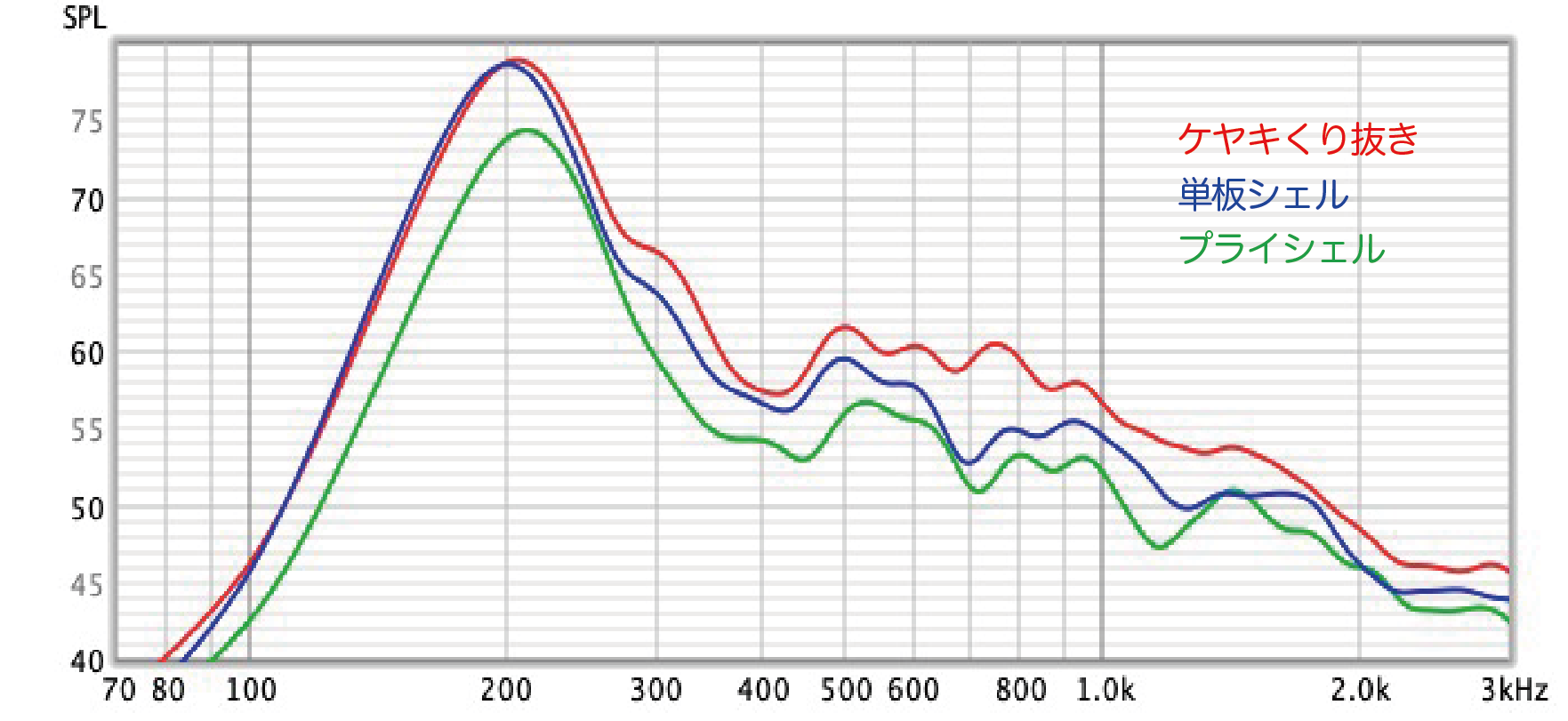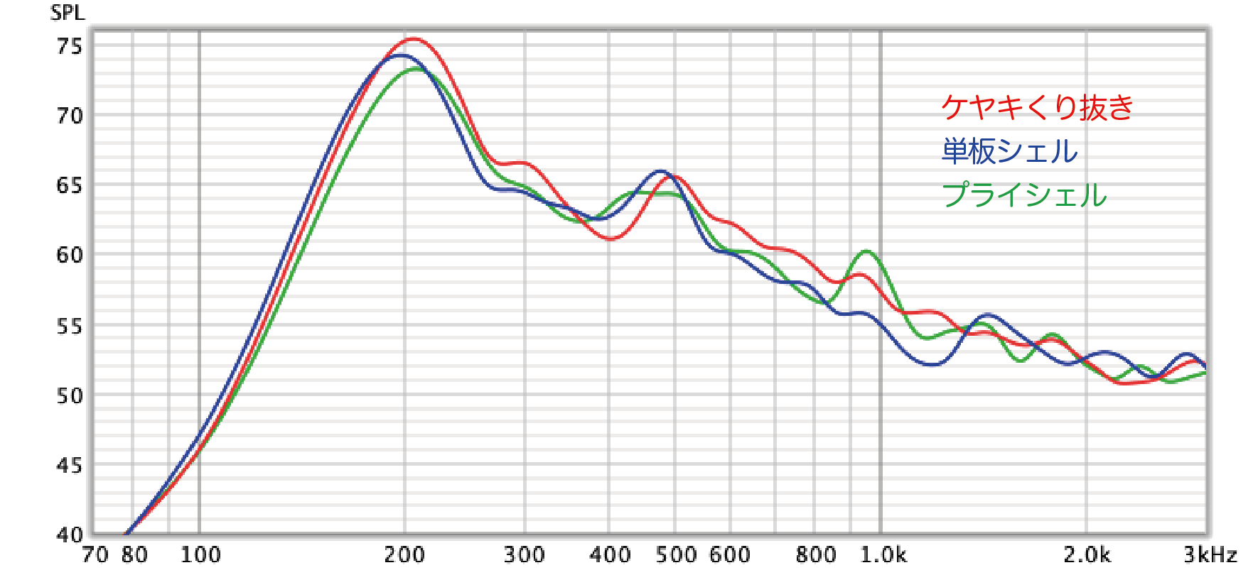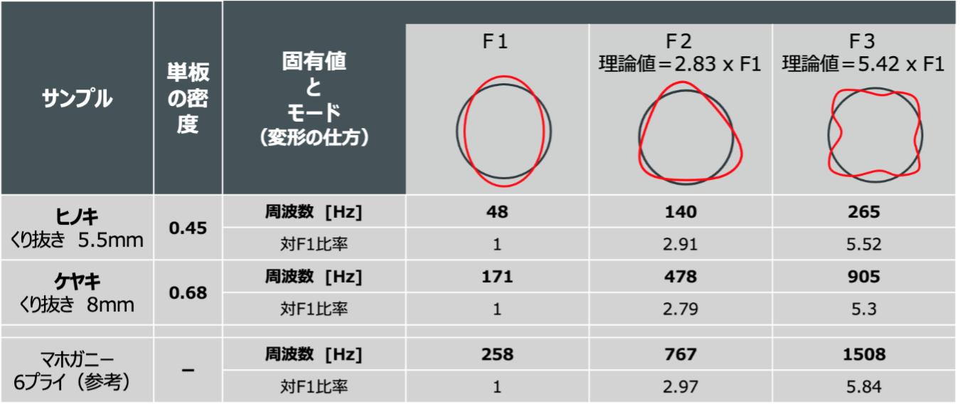 折れ線グラフ部分で容易にわかるように、くり抜きシェルは基音成分の持続時間が長いことがわかる。素材のままの繊維構造が保たれていて内部に応力が基本的にないので、メカニズム的に当然の結果といえる。