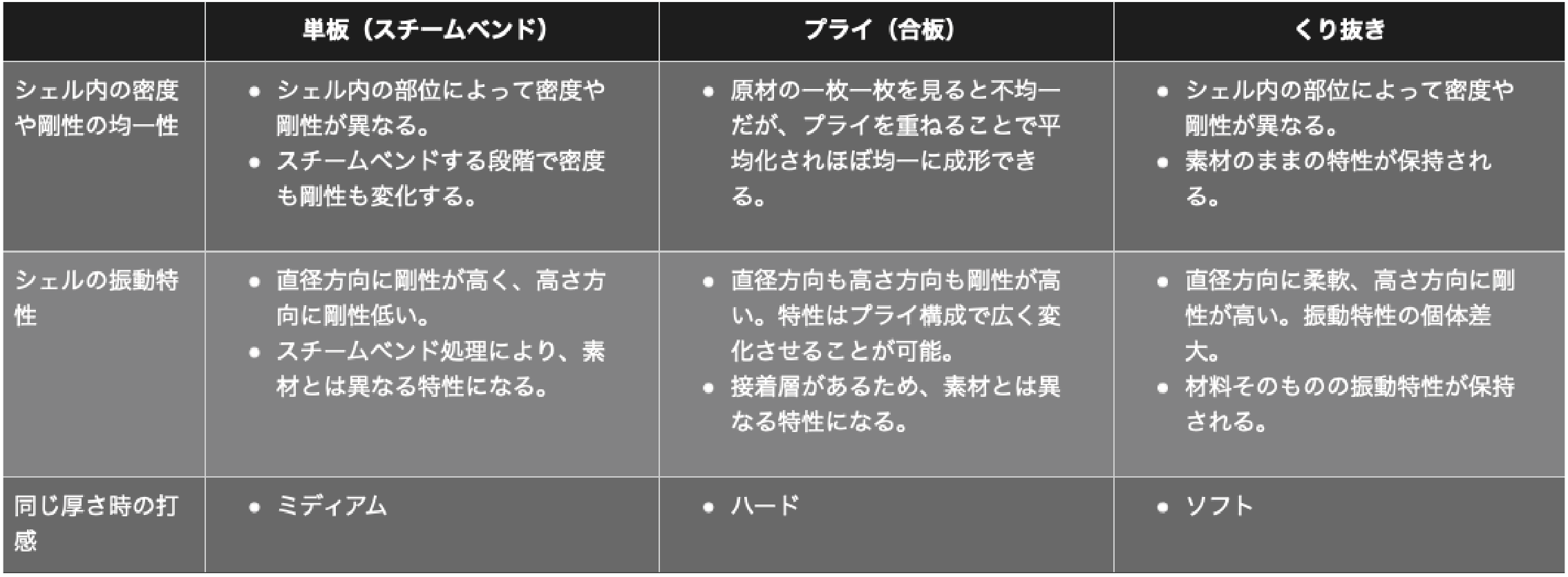 ショット時のヘッド変形にあわせてシェルも柔軟に追従して動くことで低中域の倍音が整理され、レベル的にも時間的にも基音が強調された音になる。一方木目方向である高さ方向剛性は高いため、高域の倍音も適度に保持されている。