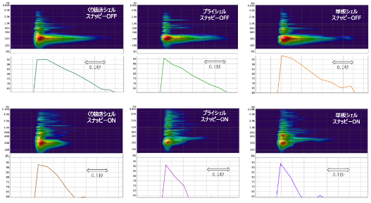 くり抜きシェル、プライシェル、単板シェルそれぞれの実音を時間軸で比較したものがFig-8である。