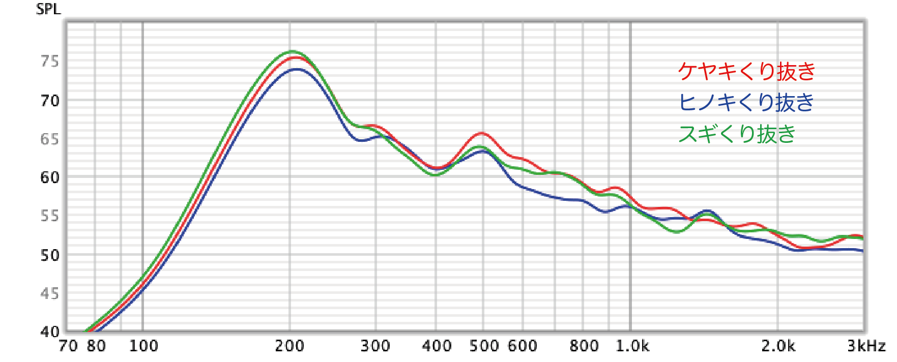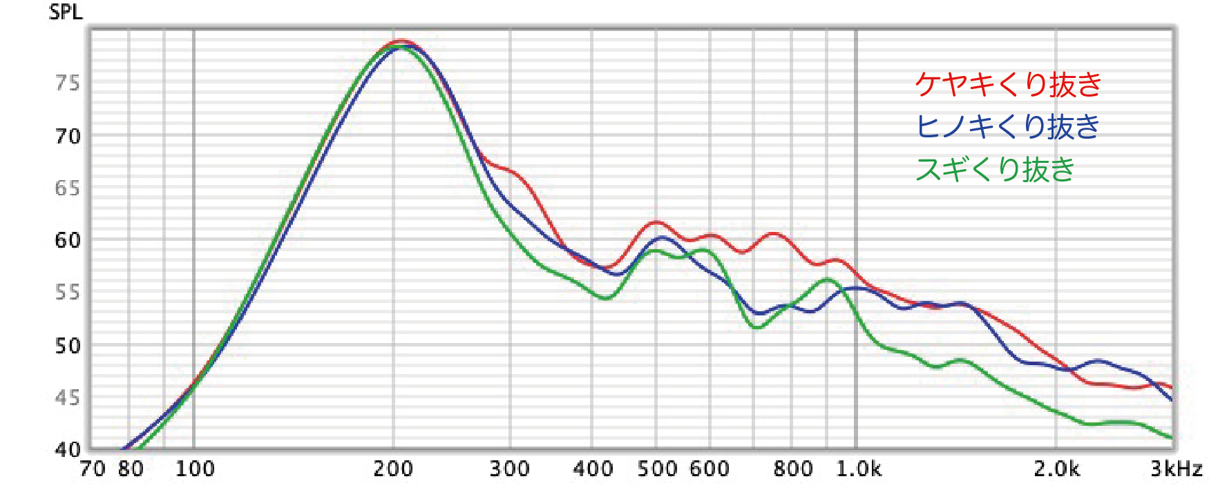 素材によって変化するパラメータは基本的に密度と弾性なので、前述のFig-5で示したとおり選ぶ材料によって固有値が変化する。違いは基音ピークよりも上の倍音特性部分にあらわれ、それぞれの個性を反映した音色となる。言葉での表現は難しいが、データ上明確な差があり、実音を聴く際の参考にして頂きたい。